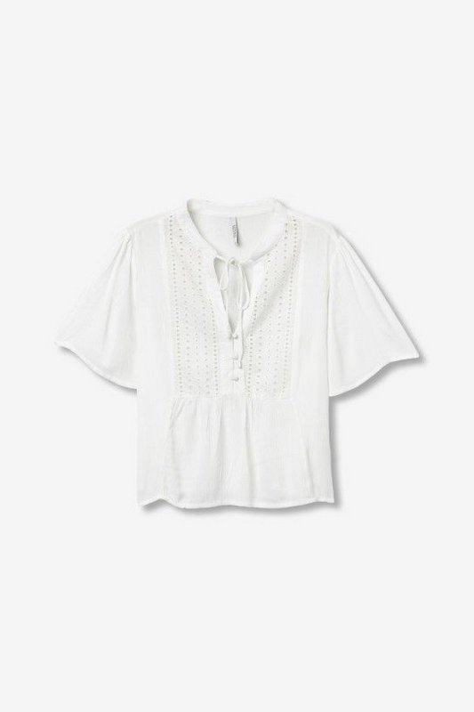 Blusa blanca de manga corta con encaje frontal y lazo, corte regular y tejido ligero.