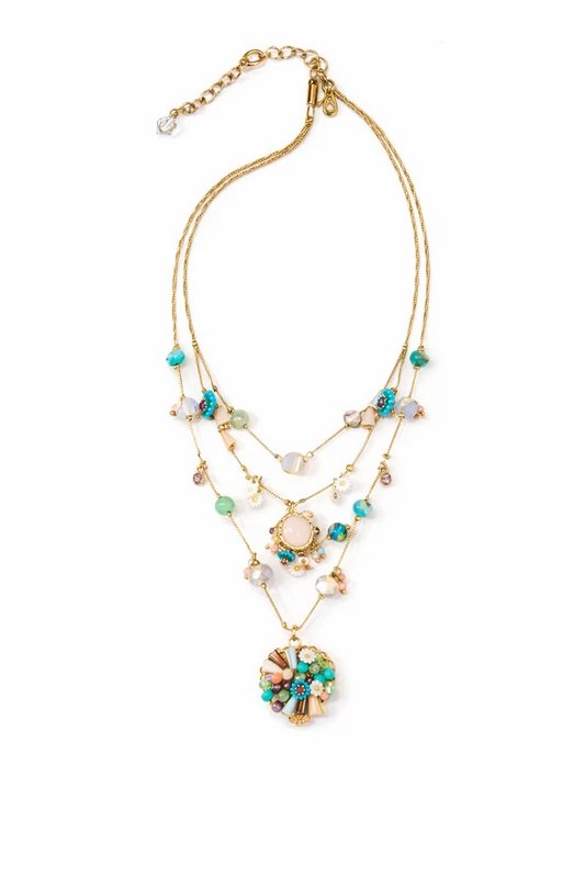 Collar con piedras multicolor y hardware en tono dorado, de 3 vueltas con cierre único y colgante central en forma de corazón