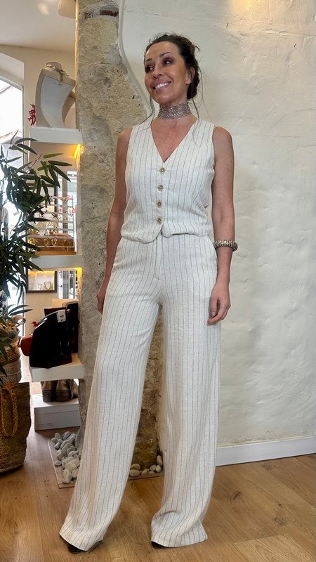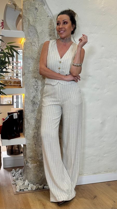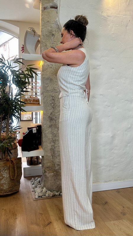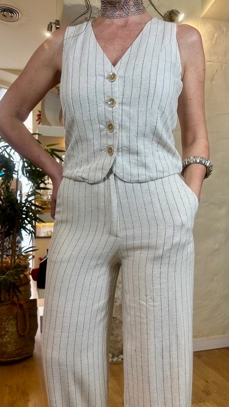 Conjunto de rayita diplomática compuesto por chaleco entallado y ajustable en la parte trasera, pantalón de corte recto y pierna ancha