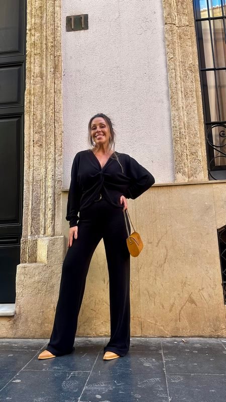 Conjunto de punto fluido, compuesto por pantalón de pata ancha, detalle de hebilla y jersey de cruce drapeado frontal y escote profundo, de estilo relajado y boho sofisticado, el pantalón sienta como un guante.