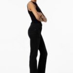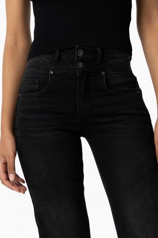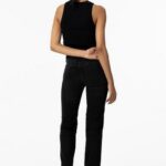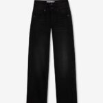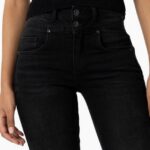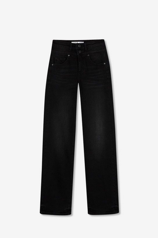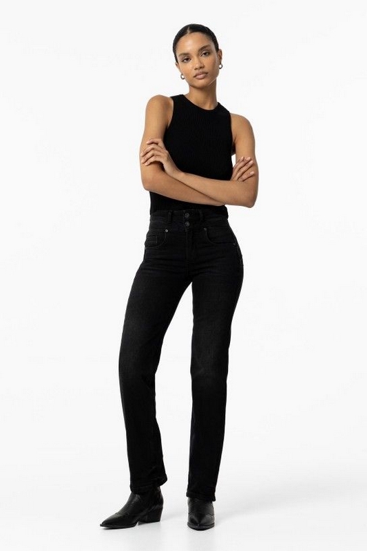 Vaqueros Double-Up de tiro alto con cinco bolsillos y pernera recta. Cierre frontal con cremallera y botón metálico.
