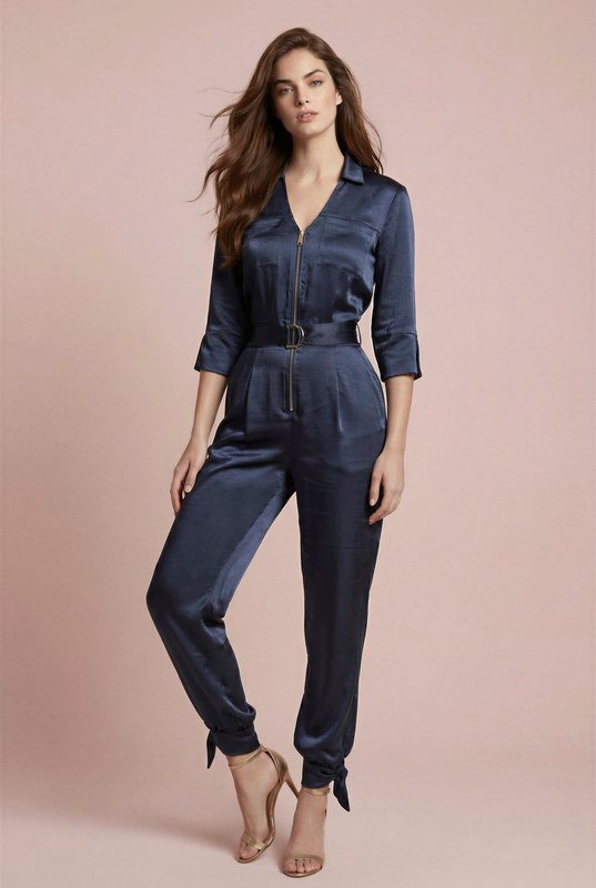 Mono bombacho de satén, escote en V con cremallera, cintura entallada con elástico en la parte trasera y bolsillos