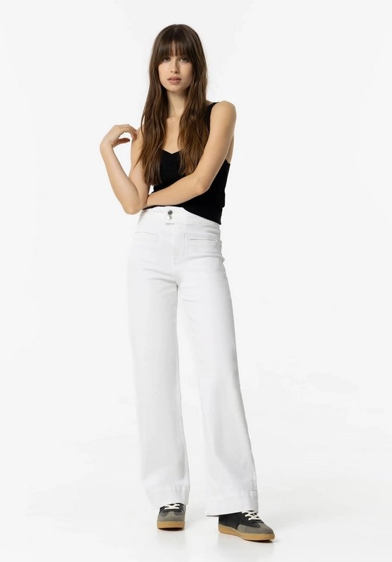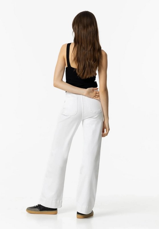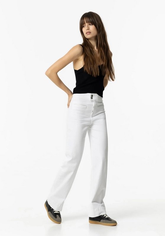 Jeans de tiro alto y pernera recta con cuatro bolsillos. Cierre frontal con cremallera y botones metálicos.