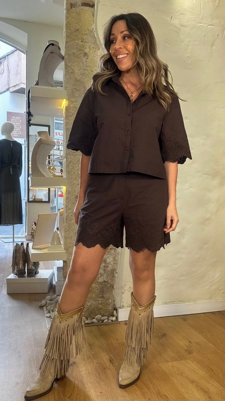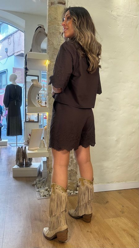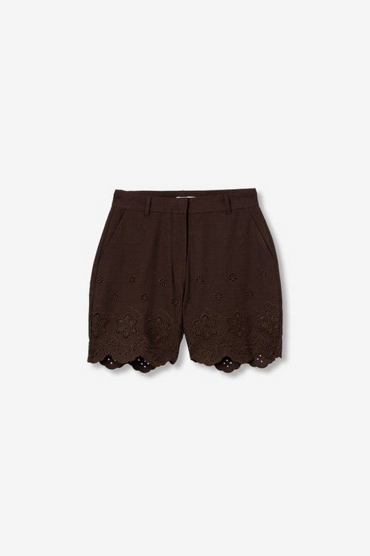 Shorts de color chocolate, corte regular, con bordado floral y bajo ondulado, estilo casual chic.