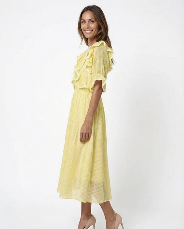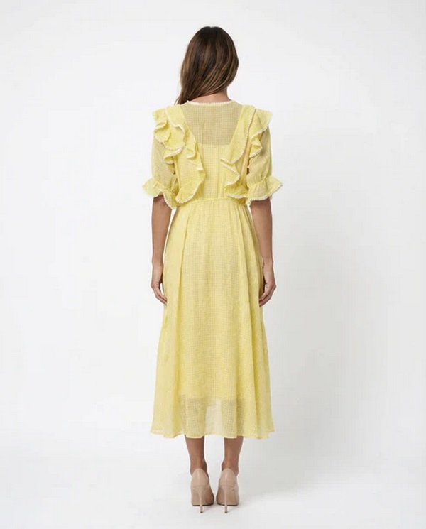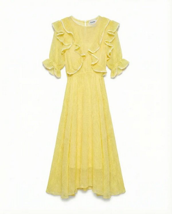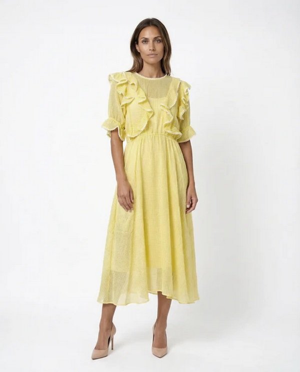 Vestido largo confeccionado en poliéster de alta calidad que combina elegancia y comodidad. Diseño exclusivo con volantes estratégicamente distribuidos que añaden movimiento y sofisticación a la prenda.