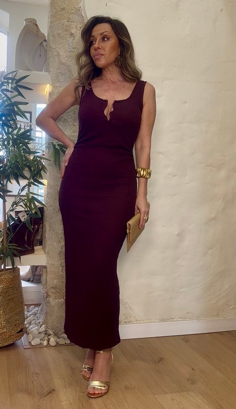 Vestido largo super slim en tono burdeos, con escote profundo y sin mangas.