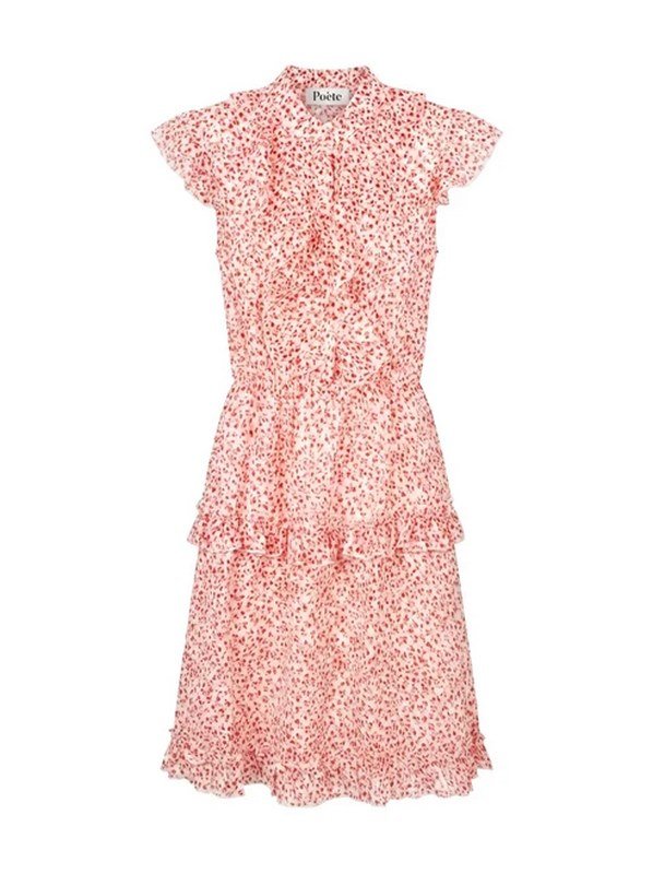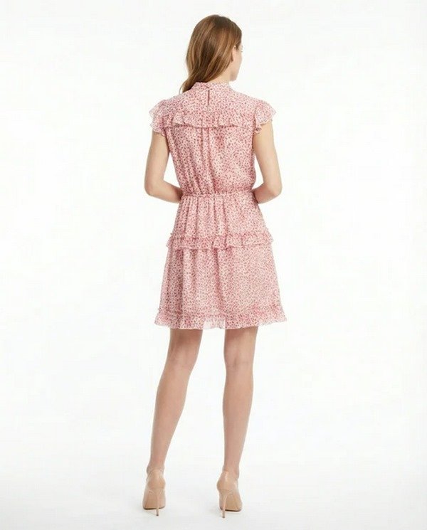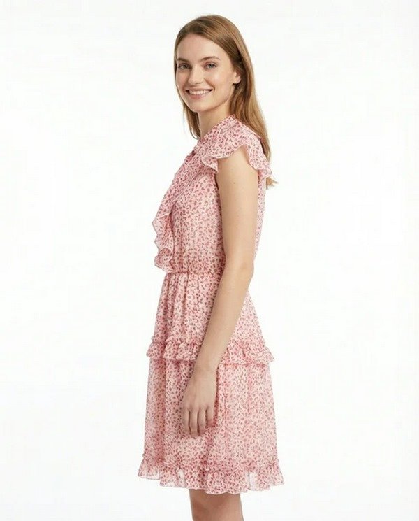 Vestido corto con diseño sin mangas que destaca por su estampado vibrante y volantes estratégicamente colocados que añaden movimiento y elegancia. Perfecto para crear looks frescos y dinámicos en cualquier ocasión.