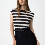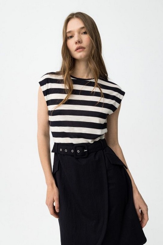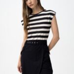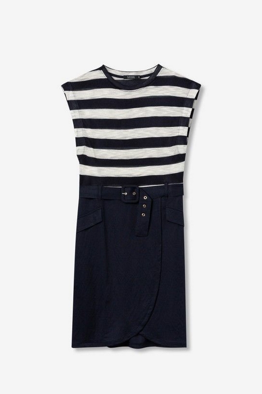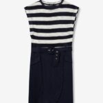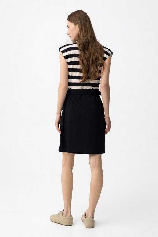 Vestido slim, parte superior a rayas blancas y negras, falda negra con cinturón y corte moderno.