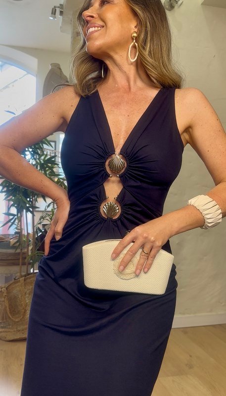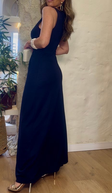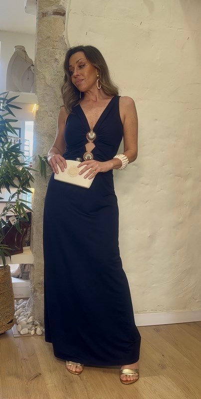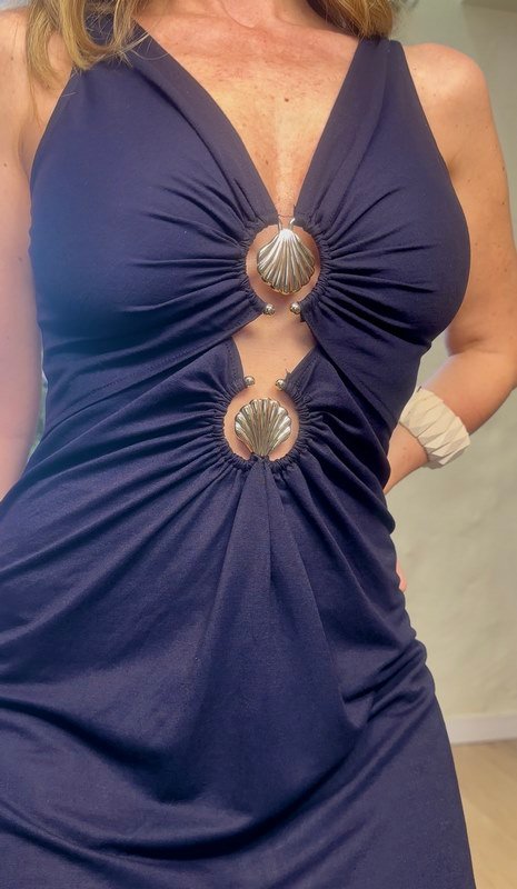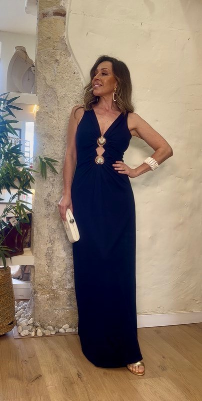 Vestido azul oscuro, corte slim, sin mangas, escote profundo y dos argollas metálicas decorativas delante.
