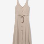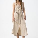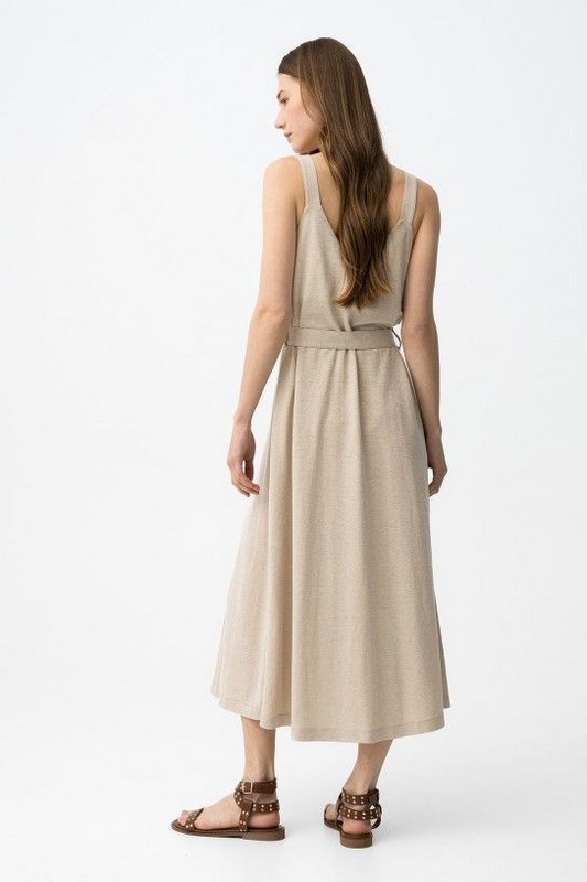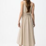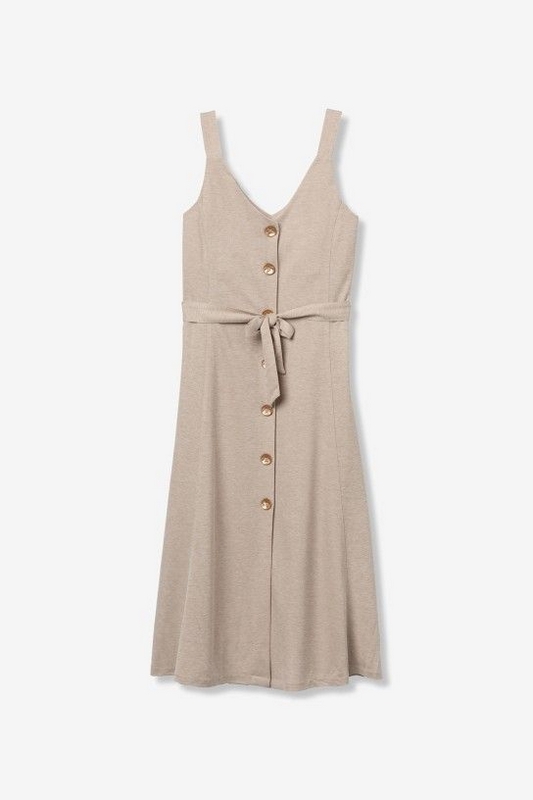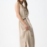 Vestido beige sin mangas, con botones delanteros y cinturón ajustable, corte regular y fluido.